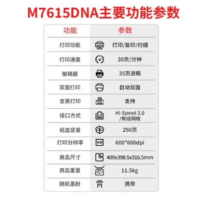 參數(shù) [品牌] 聯(lián)想 [型號(hào)] M7615DNA [產(chǎn)地] 中國(guó)大陸 [類型] 激光打印機(jī) [單位] 臺(tái)